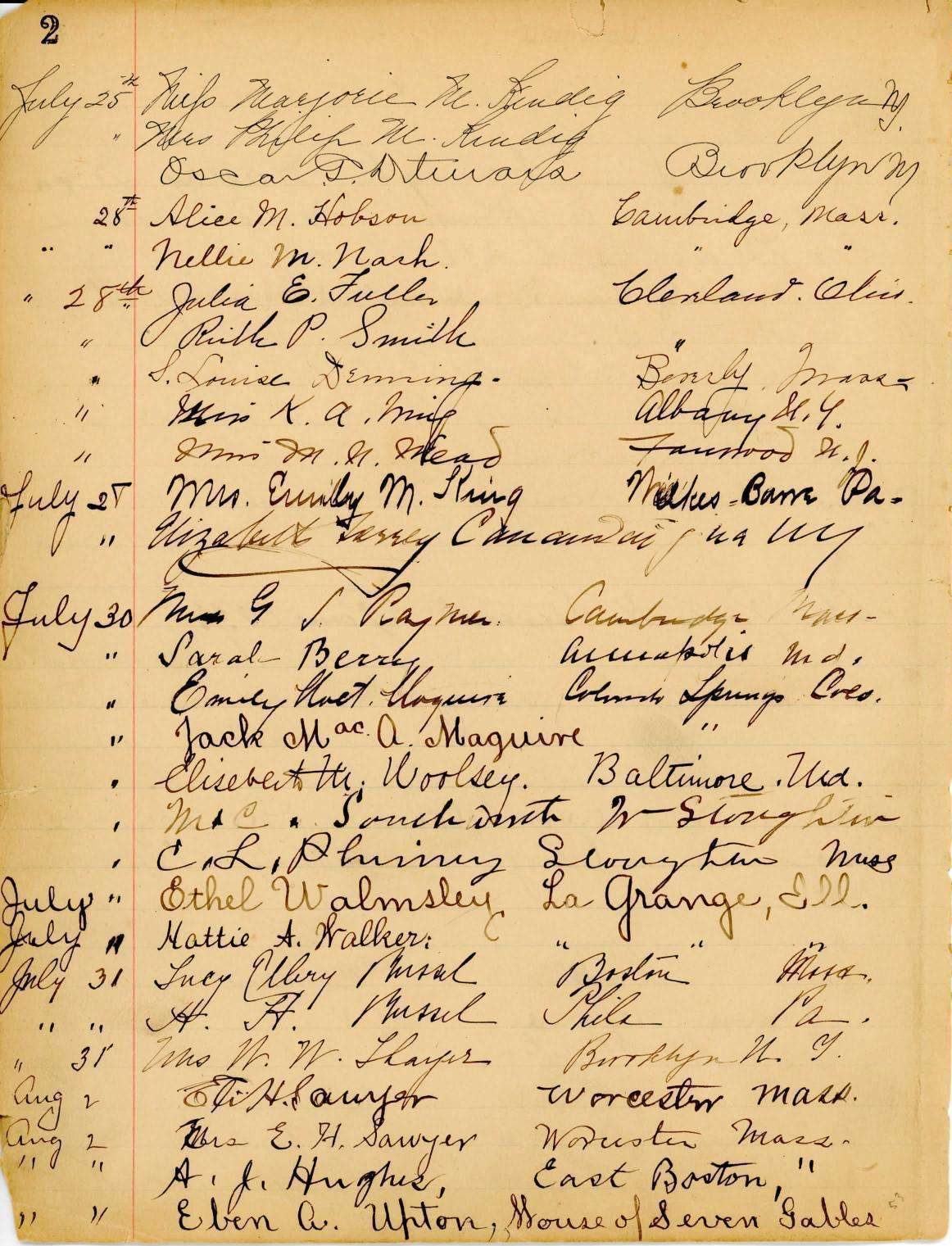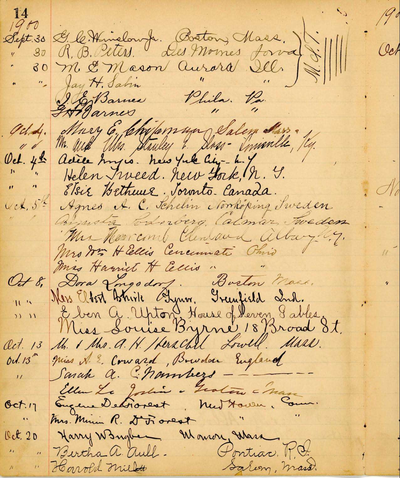 Nahaniel Hawthorne’s 1851 popular novel The House of the Seven Gables made the old Turner-Ingersoll Mansion a favorite stop for visitors to Salem. The Upton family lived in the mansion in the late 1800s and early 1900s and helped popularize their home as a tourist attraction. As can be seen in this guestbook, the Uptons welcomed visitors from all over the world to see Salem’s literary landmark; in 1900 alone they saw visitors from as far afield as Norrköping and Kalmar (spelled here ‘Calmar’) Sweden. The family capitalized on the popularity of the house by offering paid tours and handmade souvenirs for purchase.